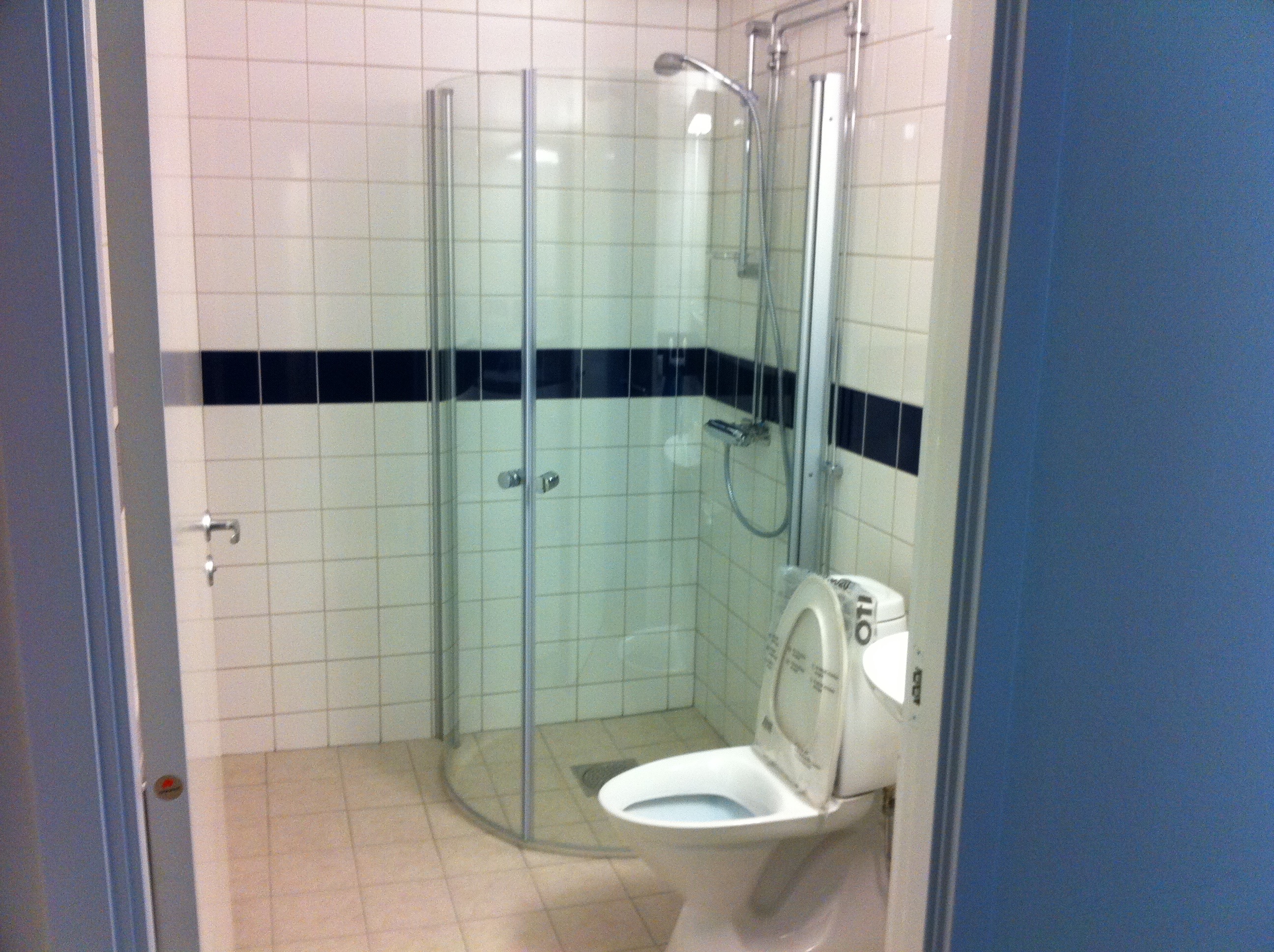 Badrum med kakel och duschdörrar. Värme och vatten ingår, hushållsel tillkommer, fiber finns men eget abonnemang krävs.